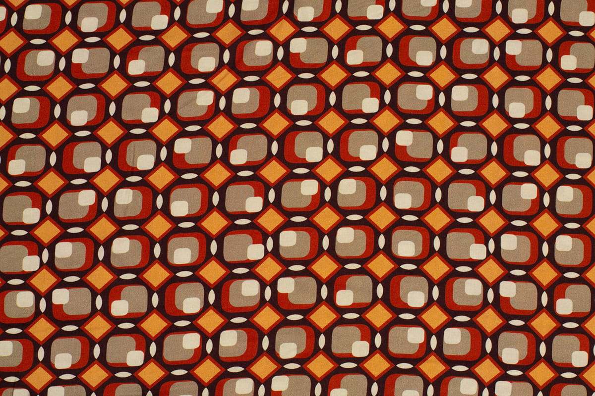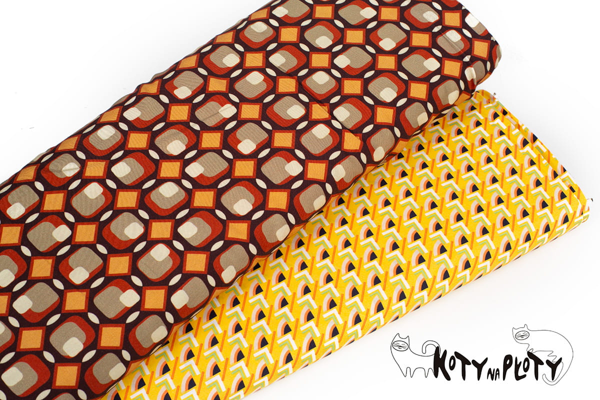 Tkaninia wiskozowa o skośnym splocie. Idealna na lekkie sukienki, bluzki, letnie kombinezony. Zadrukowana jednostronnie we wzór stylizowany na lata 70te